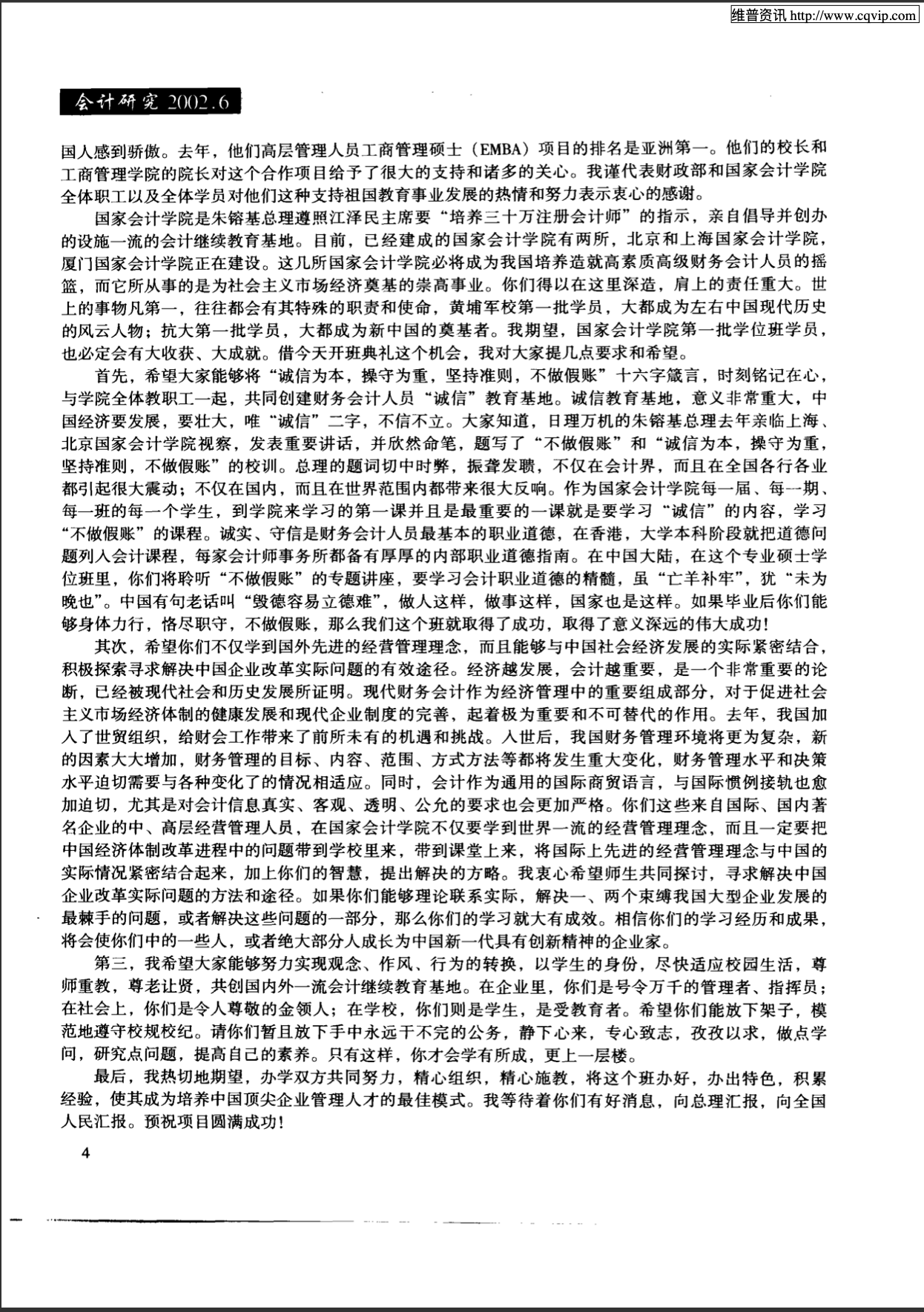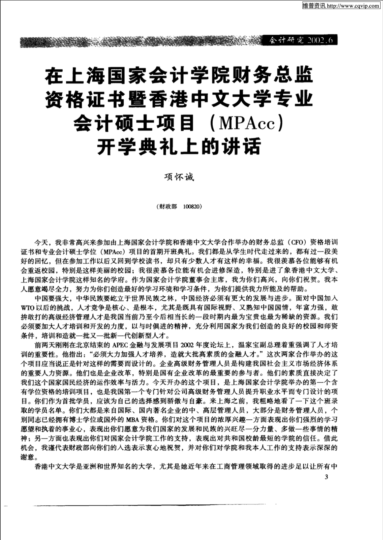 项怀诚在第一届EMPAcc项目开学典礼上的讲话(2002年)