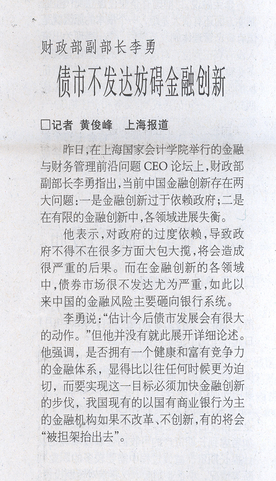 《中国证券报》关于财政部李勇副部长参加我院金融与财务管理前沿问题CEO论坛的报道