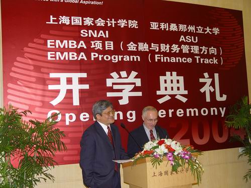 7月24日,我院与美国亚利桑那州立合作举办的EMBA项目二期举行了隆重的开学典礼。财政部人事教育司司长俞二牛应邀出席了开学典礼。我院夏大慰院长和亚利桑那州立大学凯瑞商学院院长Robert E. Mittelstaedt先生分别致辞。上海航空股份有限公司董事长周赤和上海期货交易所总经理姜洋博士分别代表一期和二期学员发言。开学典礼由我院李扣庆副院长和亚利桑那州立大学凯瑞商学院副院长贝克伟主持。全体二期学员参加了开学典礼。