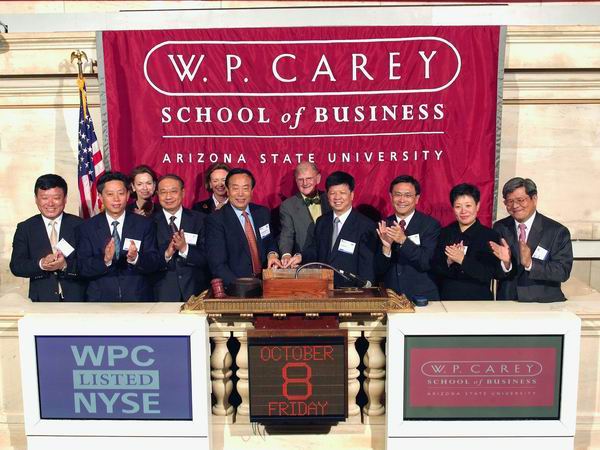 10日8日,EMBA项目一期美国学习考察团参观了纽约证券交易市场。学员代表张广生、傅建华等6位同学和纽约房地产投资银行家凯瑞先生、美国亚利桑那州立大学凯瑞商学院副院长贝克伟教授等还敲响了开市铜锣,场面非常热烈。我院谢荣副院长也参加了此次盛大的敲锣仪式。随后,考察团一行还参观了凯瑞公司、高盛银行和摩根士丹利公司。