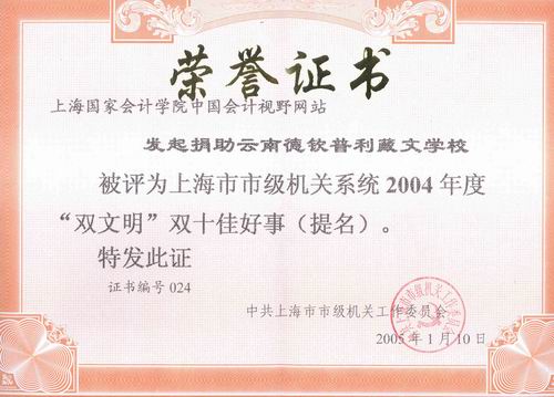 热烈祝贺会计视野网站被评为2004年度“双文明”双十佳好事称号