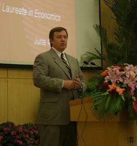 2004年诺贝尔经济学奖得主普雷斯科特教授普雷斯科特教授以“迈向富裕之路”(Overcoming Barriers to Riches)为题,向全体参与毕业典礼的学员和与会嘉宾进行了精彩演讲。在回顾了世界主要国家和地区近两个世纪以来的经济发展历程后,普雷斯科特教授指出,一个社会的生产力不仅依赖于该社会所受制的一些约束条件,而且依赖于有用知识的积累。大量事例表明,在“如何使用技术”以及“使用何种技术”两个方面的约束,往往是造成生产力落后的主要障碍。这样,为保护现有的既得利益者,更有效率的新技术无法得到采用。