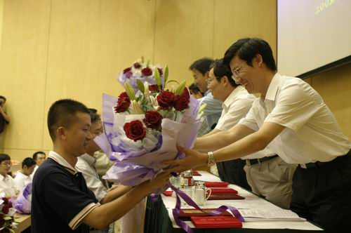 会议在谢荣副院长对财政部人教司贺电的宣读中拉开了序幕。随后,李扣庆副院长宣读了我院2005年学院先进名单,共有38位员工获此殊荣。与以往不同的是,除了评选学院先进工作者,还增加了优秀班主任、优秀行政秘书、优秀宣传员以及爱心员工等单项奖称号。4位院领导为获奖的员工颁发了证书,并赠送了鲜花。现场一片花团锦簇,气氛热烈。
