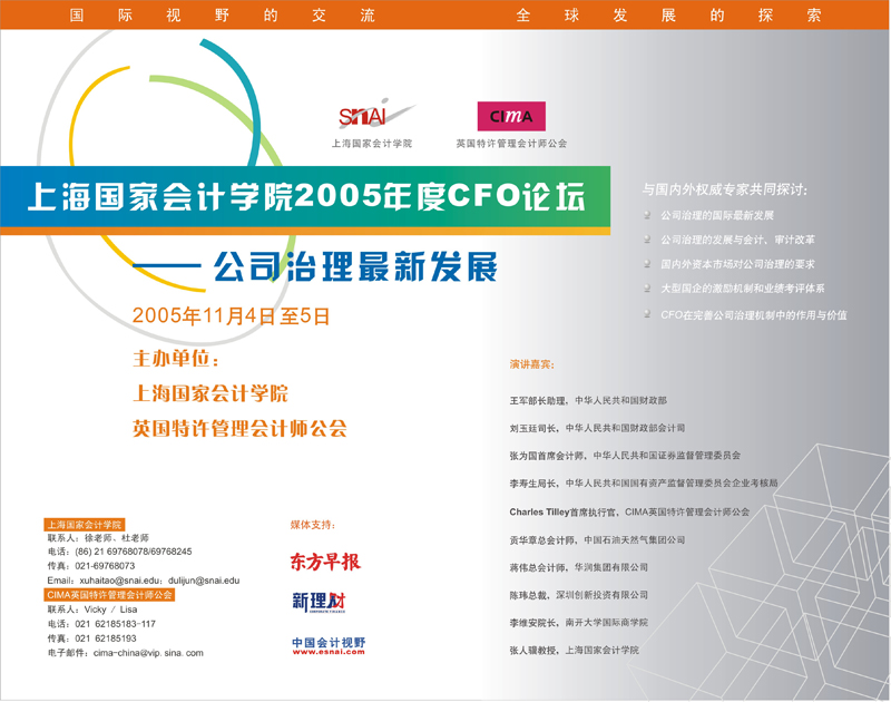 我院与CIMA希望通过此次论坛的举办,为企业界、学术界的朋友们提供一次与国内外权威专家共同探讨交流的机会。使得与会者及时了解公司治理在国际范围内的最新发展、国内外资本市场对公司治理的具体要求、公司治理的发展对我国会计、审计改革的影响、国有大中型企业在现代公司治理框架下的业绩考评体系,以及交流探索CFO在完善公司治理中的价值和作用。
