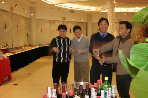 在首先进行的晚宴中,管一民副院长代表学院向大家表达了新年的诚挚祝福,并希望大家在已经到来的2006年中继续努力工作,让学院的发展跨上一个新的台阶。随后夏大慰院长和各部门代表开启了代表喜庆和祝福的香槟酒,与此同时,窗外鞭炮声响起,火光映衬在每一个员工盛满了笑意的脸上,大家不禁纷纷举杯,为学院2005年取得的成就,也为学院前景更为广阔的未来。