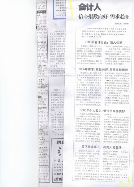 调查显示,投票人对过去一年会计行业的总体评价值是103.37,接近临界值,也就是评价一般偏好;但对2006年度会计行业的信心趋高,信心指数是112.10。其中: