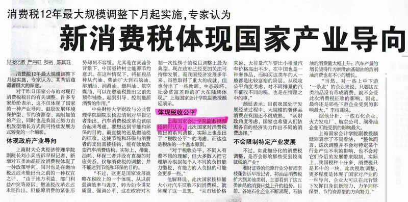 上海国家会计学院副教授颜延则表示了不同看法,“整体而言,这次调整并不会对特定某个行业产生不利的影响,也不会对它们今后的发展带来限制。实际上,我国税种十分多,消费税只是其中的一块。此次税收调整,更多程度是体现了国家对产业的一种导向,企业大可以在此背景下发挥自身创新能力,力争向环保型、节约资源型的方向努力。”