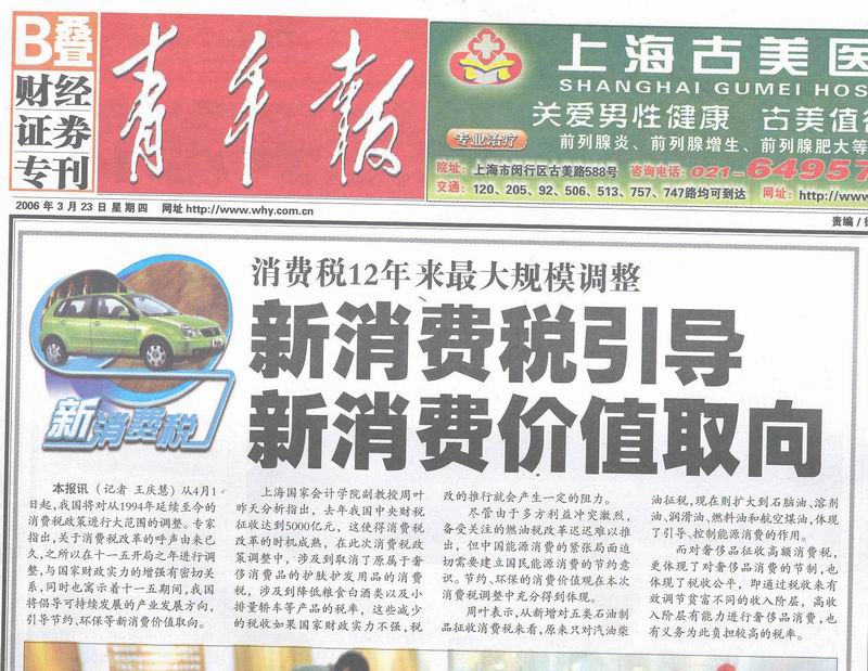 《青年报》2006年3月23日:消费税12年来最大规模调整 新消费税引导新消费价值取向