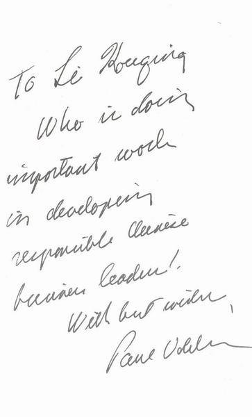 沃尔克还是中国人民的朋友。无论是在他担任美联储主席期间,还是在卸任之后,沃尔克都对中国的金融改革开放给予了密切关注和热情支持。他曾经多次访问中国,就金融改革中的重大问题,向中国政府坦陈己见。中国中央银行的很多领导者和工作人员,都与沃尔克有过近距离接触,并且从他言简意赅但富有这里的言谈中获益匪浅。”