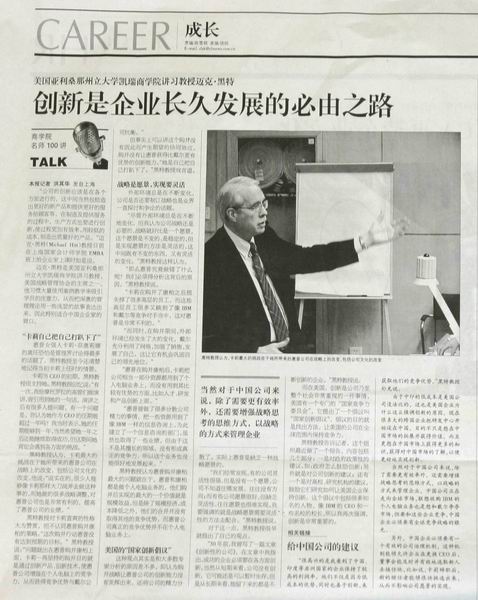 “30年前,我曾写了一篇文章《创新性的公司》,在文章中我指出,成功的企业必须要在各方面创新,当然从短期来看,公司没有创新,它可能还是可以暂时生存,但是从长期来看,能留下来的都是不断创新的企业。”黑特教授说。