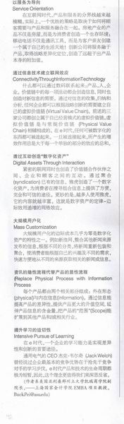 第二个特色是上一个的自然延伸。e时代的企业专注于建立价值链关系的培养与建立,从而能使用价值链上其它公司的产能。这表示使用资产并不一定要拥有资产!但是,要运用其他人的资产企业———一个在财务报表上无法显示的无形资产。如何才能建立可靠、有可持续的关系资产呢?关键是通过合伙联盟,建立诚信,相互依存。这要求价值链所有参与者完全改变既定的传统思维.企业谈判时不能以价格和威逼为主导,重要的是寻求长期合作(如联合研发)共同创建互相依存的战略资产。