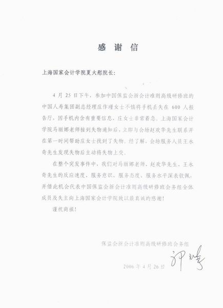 在感谢信中,会务组对学院工作人员的热情服务、快速反应表示钦佩,并同时代表失主向我院致以最真诚的感谢。(编辑:李泓)
