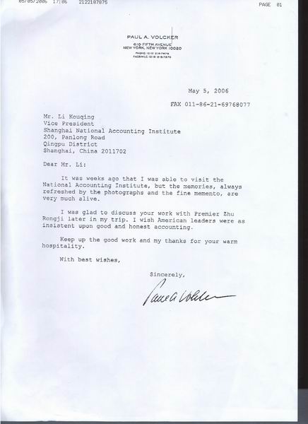 (通讯员:程艳萍)近日,我院收到前联邦储备委员会主席保罗•沃尔克(PAUL A. VOLCKER)致学院的感谢信。保罗先生一行于今年4月中旬访问我院,访问期间他全面地了解了学院的发展状况并和院方就高层管理人才培养的问题进行了深入地交流。他在信中表达了对我院热情接待的感谢,同时也提及了学院的优美环境和办学模式给他留下了深刻印象。