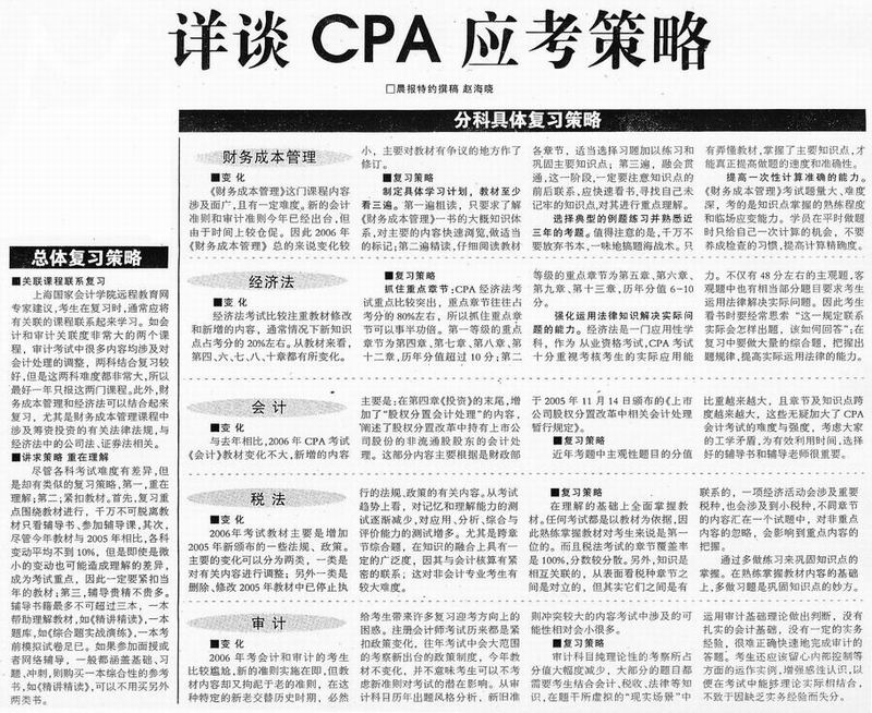 (通讯员:邓建峰)4月30日,2006年度全国CPA考试报名工作已经结束。据统计2006年参加CPA的上海考生为37330人,比2005年增加了两个百分点。日前新闻晨报的特约记者就2006年CPA的考前复习所应注意的相关问题,采访了我院远程教育部的网上辅导专家。专家们就CPA考前总体复习的重点内容,简明直观地进行了概括说明,并就课程复习中的关联性和策略性进行了重点阐述。随后又针对《会计》、《审计》、《经济法》、《税法》和《财务成本管理》这五门课程的分科复习情况,作了详尽而又具体的指导。广大考生如能按照专家所指点科学方法认真、全面地复习,定能取得事半功倍的效果。