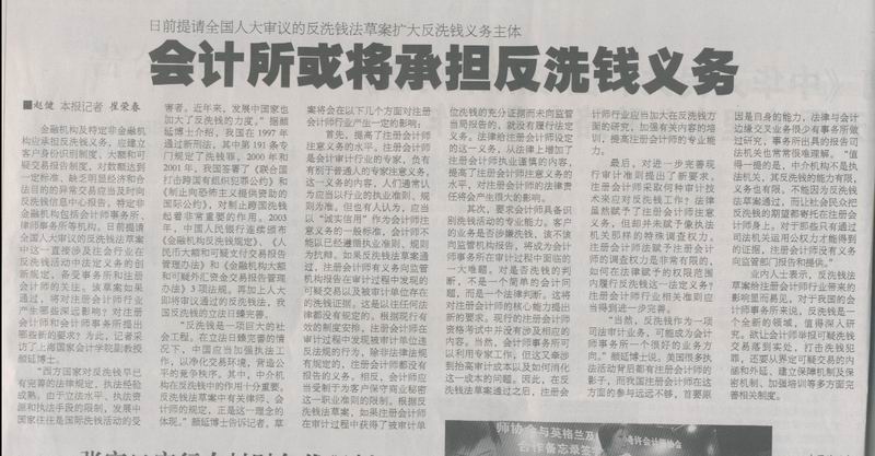 业内人士表示,反洗钱法草案给注册会计师行业带来的影响显而易见,对于我国的会计师事务所来说,反洗钱是一个全新的领域,值得深入研究。欲让会计师举报可疑洗钱交易落到实处,打击洗钱犯罪,还要从界定可疑交易的内涵和外延、建立保障机制及保密机制、加强培训等多方面完善相关制度。