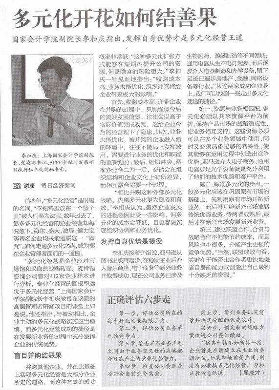 国家会计学院副院长李扣庆指出,发挥自身优势才是多元化经营王道
