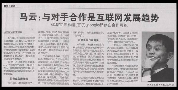 而对于近日雅虎与老对手eBay在美国宣布合并一事,马云表示不会影响到淘宝的业务。他希望借此推动市场走向竞争与合作的阶段。