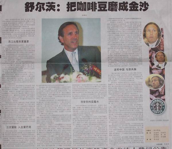 扩张还会带来不同文化间的碰撞。舒尔茨聊起了中国,“1999年的时候,我们在北京创立了第一家店,我公开说过好几次,中国是星巴克最重要的、最具有战略意义的市场,它最终将成为我们的第二大市场。”笔者问,星巴克如何应对中国传统的茶文化?他驾轻就熟地回答:“不管到哪里,包括纽约、芝加哥或者巴黎,每进入一个城市,我们都尊重当地的文化。中国人喜欢喝茶,茶馆也是人们交流的场所。不过,我们还是想提供一种新的生活方式,我们创造自己的体验,而不是挑起茶文化和咖啡文化的竞争。”