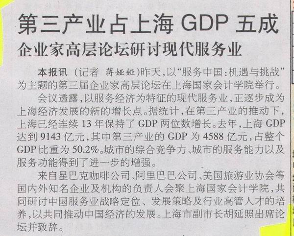 《解放日报》2006年6月8日:第三产业占上海GP五成