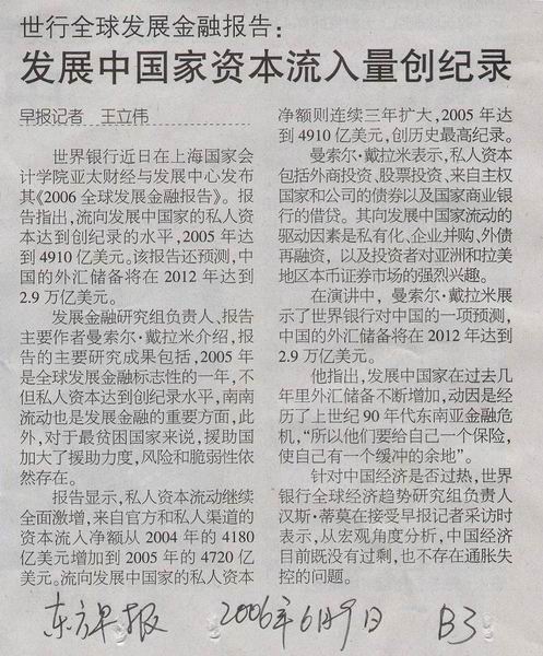 世界银行近日在上海国家会计学院亚太财经与发展中心发布其《2006全球发展金融报告》。报告指出,流向发展中国家的私人资本达到创纪录的水平,2005年达到4910亿美元。该报告还预测,中国的外汇储备将在2012年达到2.9万亿美元。