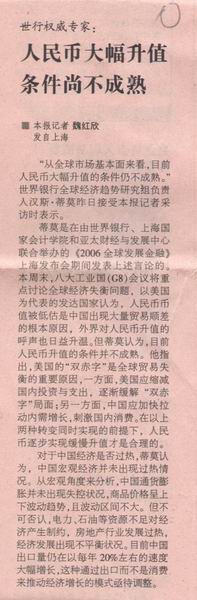 《国际金融报》2006年6月8日头版:人民币大幅升值条件尚不成熟
