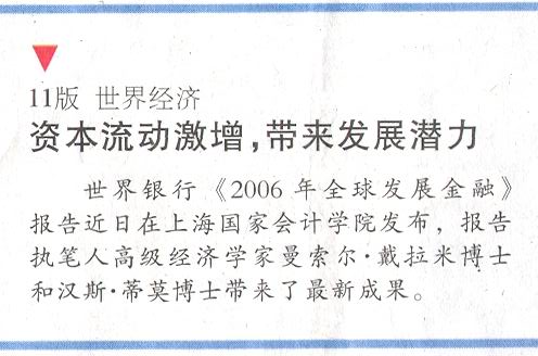 5月30日,世界银行发表《2006年全球发展金融》报告;6月7日,由上海国家会计学院和亚太财经与发展中心承办的世界银行《2006年全球发展金融》发布会在上海国家会计学院举行。会上,世界银行《2006年全球发展金融》主要执笔人、发展经济学高级经济学家曼索尔·戴拉米博士和世界银行全球经济趋势研究组负责人、高级经济学家汉斯·蒂莫博士共同介绍了报告中的主要观点。