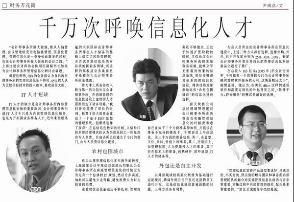 调查也表明70%的会计师认为自己所在的事务所的管理信息化还不够用,85%的人认为比较信息技术的投入成本,是收获很大的。