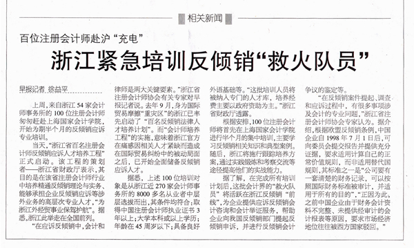 当天,“浙江省百名注册会计师反倾销应诉人才培养工程”正式启动。该工程的策划者———浙江省财政厅表示,其目的是在该省注册会计师行业中培养精通反倾销理论与实务、能够承担企业反倾销应诉等涉外业务的高层次专业人才,“为浙江外经贸事业保驾护航”。据悉,浙江此举走在全国前列。