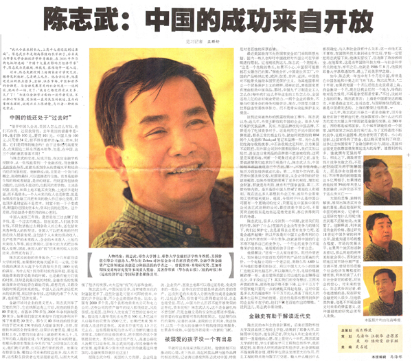 人物档案:陈志武,耶鲁大学博士,耶鲁大学金融经济学终身教授,美国价值引擎公司创办人,华尔街Zebra对冲基金公司首席投资经理,金融学和金融资产定价领域最具创造力和最活跃的学者之一。曾获默顿·米勒研究奖、芝加哥期权交易所研究奖等多项重大奖励。其著作常被《华尔街日报》、《纽约时报》和《远东经济评论》等国际著名媒体引用。