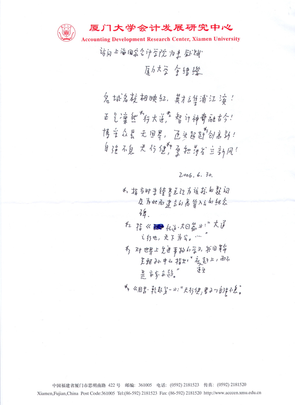(通讯员:温庆远、李泓)近日,我院收到厦门大学余绪缨教授致学院的词赋。此前,余绪缨教授于6月上旬受邀为第29期国有企业总会计师培训班作了精彩演讲,与师生进行了交流,并参观了学院。回去之后,余绪缨教授对此行有感而发,遂赋词一首。