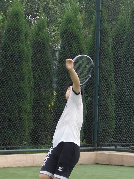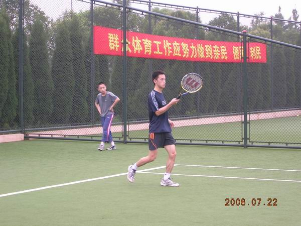 上午8时整,徐晨,一名经验丰富、临场冷静的智慧型选手代表学院首战出赛,对手也是一名老将,无论从赛场经验、搏杀技能、体能耐力等方面看,二人都不相上下。开场10分钟,双方持平。此时,第一盘已经过半,徐晨发现了对手的空档,利用发球机会频繁得分,以迅雷不及掩耳之势迅速拿下第一盘。而经过前一晚的雨水浸润,赛场草皮滑腻不堪,不仅使选手控球的压力骤增,而且对选手在场上的剧烈跑动造成了一定的安全威胁。第二盘开场,徐晨保持稳定的发挥,连连得分。而对手在先失一局的情况下,心躁气盛,以至疲于应付。而就在徐晨胜券在握,趁胜追击之际,他救球心切,一个滑跤,坐倒在地,赛场气氛重新紧张了起来。在受伤的情况下,徐晨仍坚持赛完本局,比分重新以一比一持平。稍事休息确定无大碍之后,徐晨再次上场,毫无悬念地拿下了第二盘,顺利出线,进入复赛。