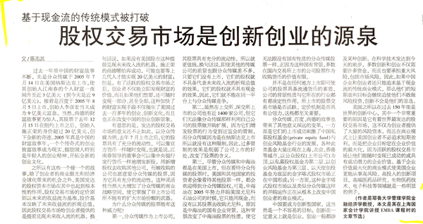 之所以有这些一个接一个的故事,除了创业者的商业眼光和经济全球化带来的机会之外,美国发达的股权资本市场在其中也起到根本性的作用,股权交易市场的定价原则以未来的收益流为基准,股价基本反映了未来收益流的折现总值,因此股权交易市场给创业者提供的是提前兑现未来收入流的机器。换句话说,如果没有美国股市这种提前兑现未来收入流的机器,施正荣的尚德哪怕再成功,可能也要等上几代人才能实现20亿美元的财富;但是,有了活跃的股权交易市场之后,创业者不仅能立即发现财富的价值,而且如果他们想要,还可随时变现一部分、甚至全部。这种加快了的财富实现手段不仅催生了美国过去一百多年的创业、创新文化,而且也正在改变中国的创业创新景象。