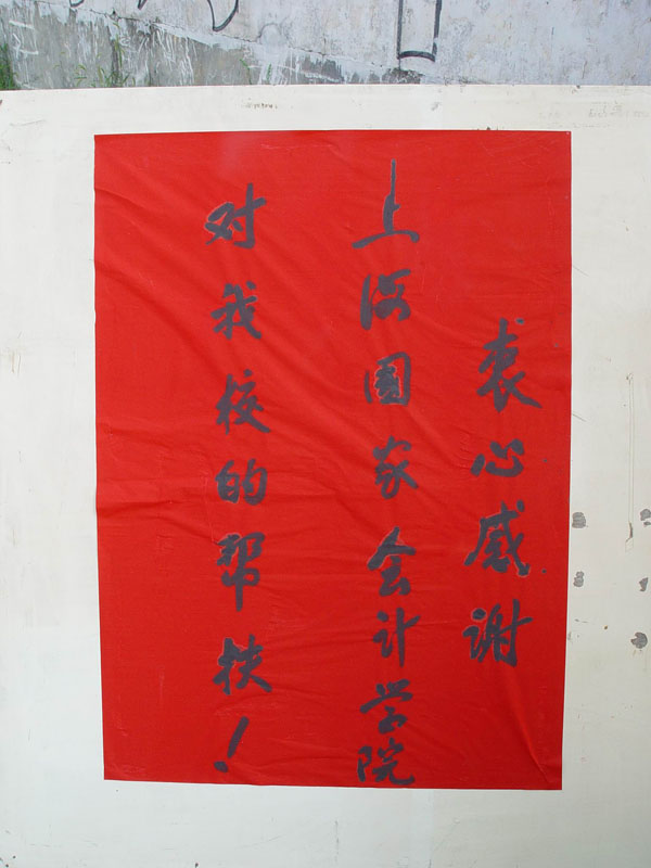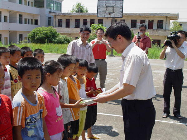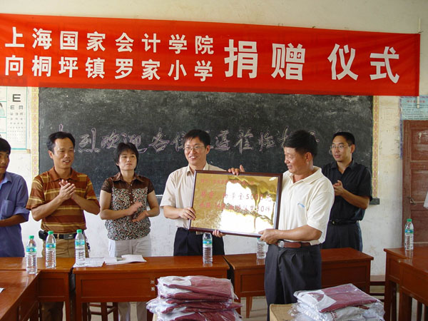 31日上午,坐了一夜火车和一个多小时的山路汽车,爱心团一行终于抵达了吉安县桐坪镇罗家小学。团组受到了罗家小学师生的热烈欢迎,鞭炮鸣天响,鲜花插满园,处处可见“向上海国家会计学院致敬”的标幅。在学校唯一的一栋三层教学楼中,举行了简短而又热烈的捐助仪式。桐坪镇镇长、罗家小学校长、吉安县教育局教工处主任、罗家小学学生代表等一一发言,衷心感谢我院的善举,并纷纷表示我院的捐助不仅仅是物质上的捐助,更是一笔无形的精神财富,罗家小学将不负众望,努力提高办学水平,精心培养祖国的花朵,更重要的是培养学生的爱心,并将爱心传递。我院汤超义主任代表学院以及学院领导对罗家小学师生表示问候,希望全体师生能够克服困难,办出效果、办出成绩。我院将会和罗家小学建立长期助学机制,通过和老师多沟通教学方法,设立“上海国家会计学院奖学金”,奖励那些优异的学生。