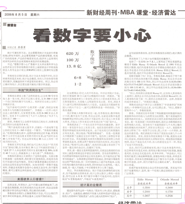 “所以,你向俱乐部推销Murray时,应该给人看表格的上面两行,提供左右手的击球成功率;而推销Merced时,给人看表格的最下面一行,提供总击球成功率。这样,你推销的成功率就高了。”李教授打趣道。