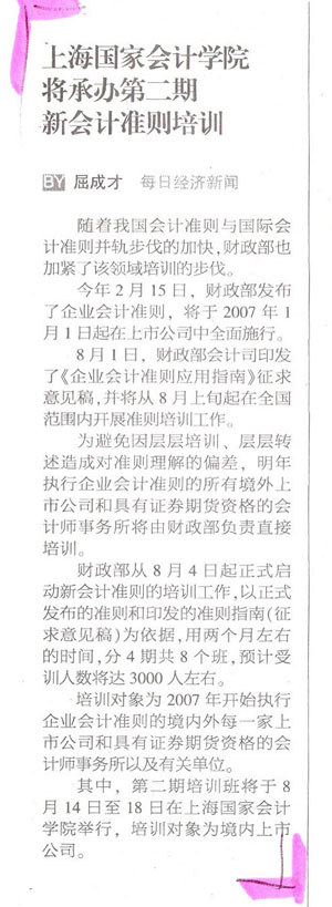 《每日经济新闻》2006年8月9日:上海国家会计学院将承办第二期新会计准则培训