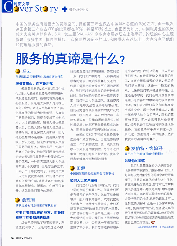 中国的服务业有着巨大的发展空间,目前第三产业仅占中国GDP总值的40%左右,而一般发达国家第三产业占GDP的比重都在70%,甚至80%以上。也正因为如此,中国服务业的发展成为大家关注的焦点。6月,第三届SNAI-ASU企业家高层论坛在上海举行,论坛的中心主题就是"服务中国:机遇与挑战",众多世界级企业的CEO和领导人在论坛上与大家分享了他们如何理解服务的真谛。