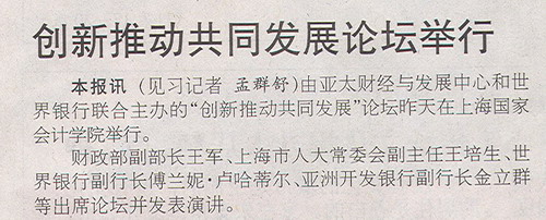 由亚太财经与发展中心和世界银行联合主办的“创新推动共同发展”论坛昨天在上海国家会计学院举行。