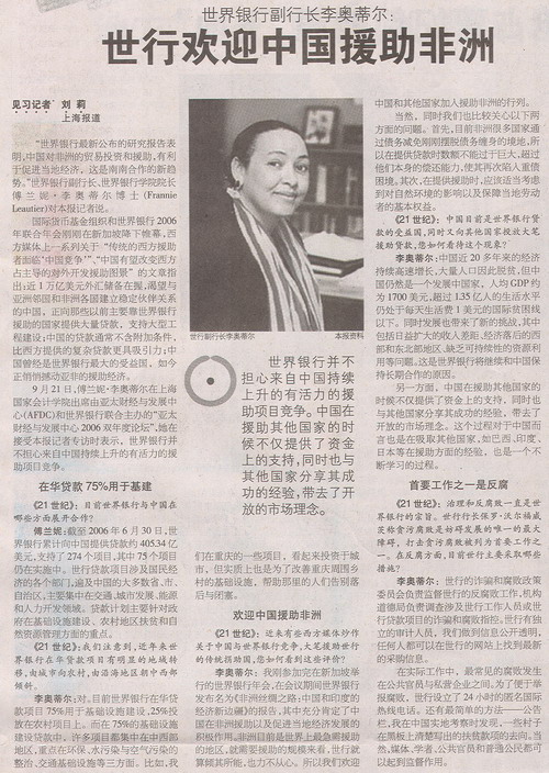 “世界银行最新公布的研究报告表明,中国对非洲的贸易投资和援助,有利于促进当地经济,这是南南合作的新趋势。”世界银行副行长、世界银行学院院长傅兰妮·李奥蒂尔博士(Frannie Leautier)对本报记者说。