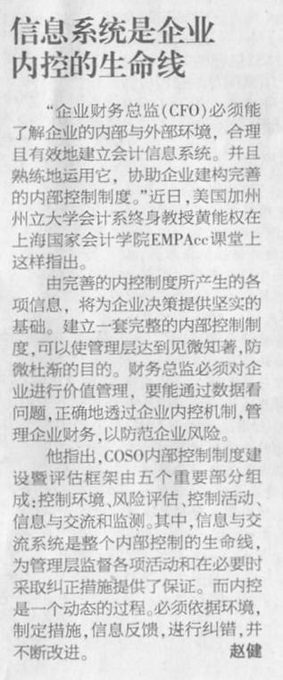 《每日经济新闻》2007年3月22日:信息系统是企业内控的生命线