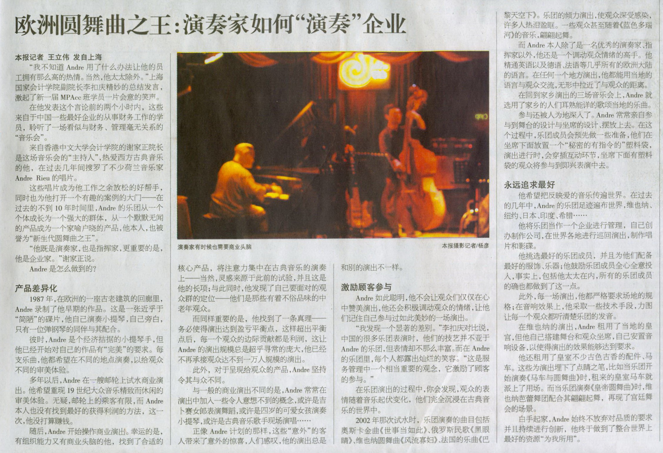 “我发现一个显著的差别。”李扣庆对比说,中国的很多乐团表演时,他们的技艺并不亚于Andre的乐团,但表情却不那么丰富。而在Andre的乐团里,每个人都露出灿烂的笑容。“这是服务管理中一个相当重要的观念,它激励了顾客的参与。”