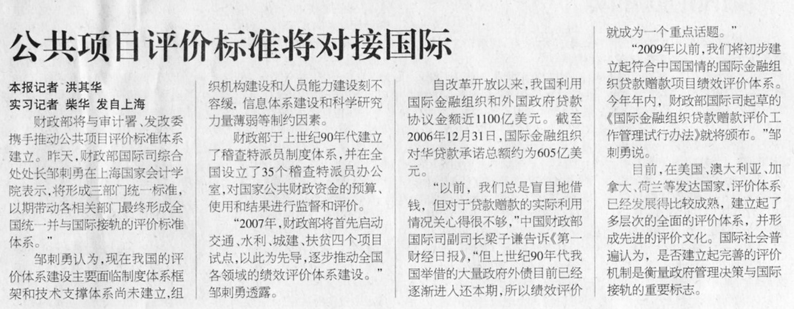 “2009年以前,我们将初步建立起符合中国国情的国际金融组织贷款赠款项目绩效评价体系。今年年内,财政部国际司起草的《国际金融组织贷款赠款评价工作管理试行办法》就将颁布。”邹刺勇说。