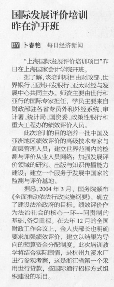 《每日经济新闻》2007年4月10日:国际发展评价培训项目在沪开班
