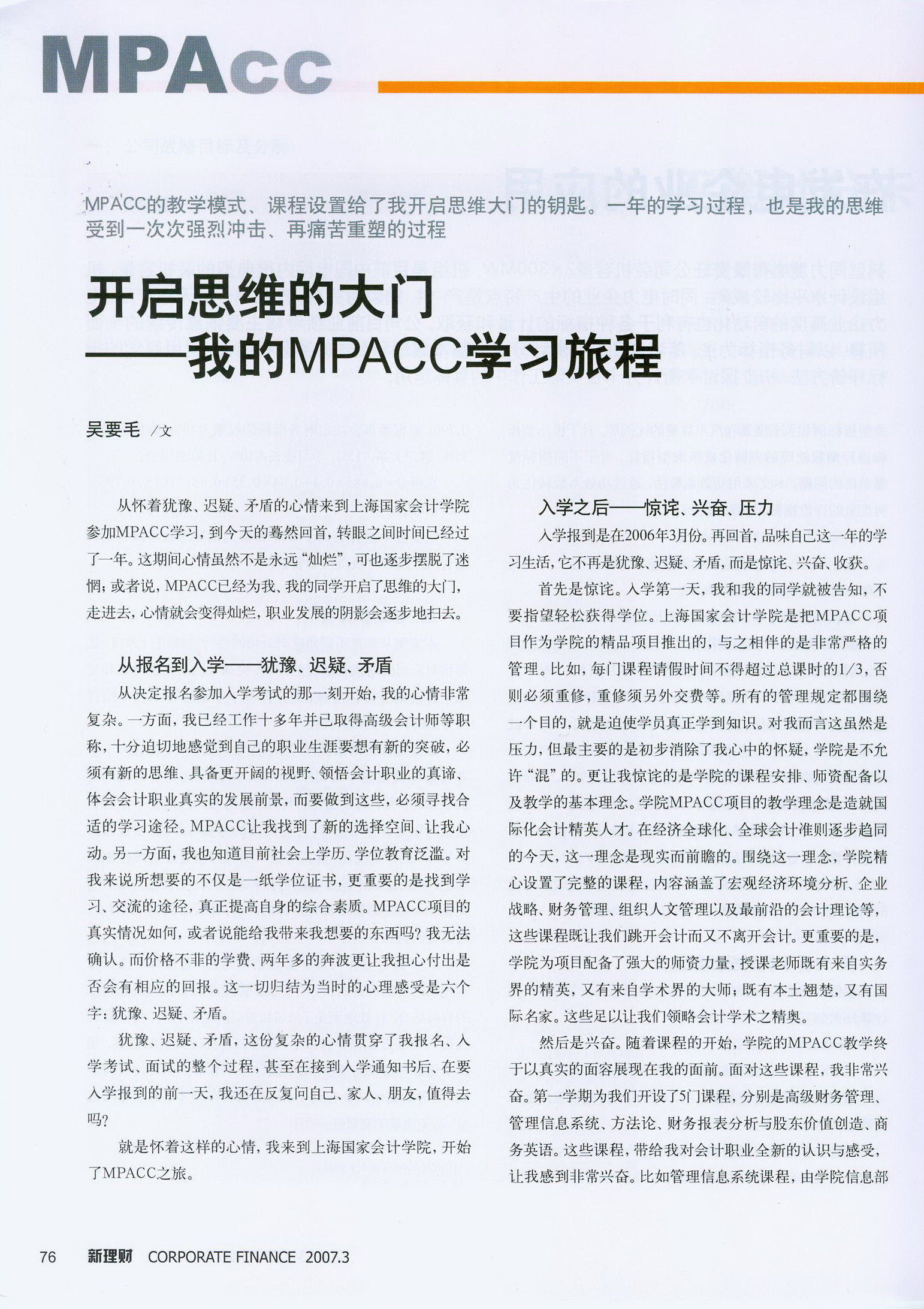从犹豫、迟疑、矛盾,到惊诧、兴奋、压力,转眼之间,一个学年的学习已经结束了。蓦然回首,尽管一切依旧,但我已经有一份最重的收获:MPACC为我开启了思维的大门。