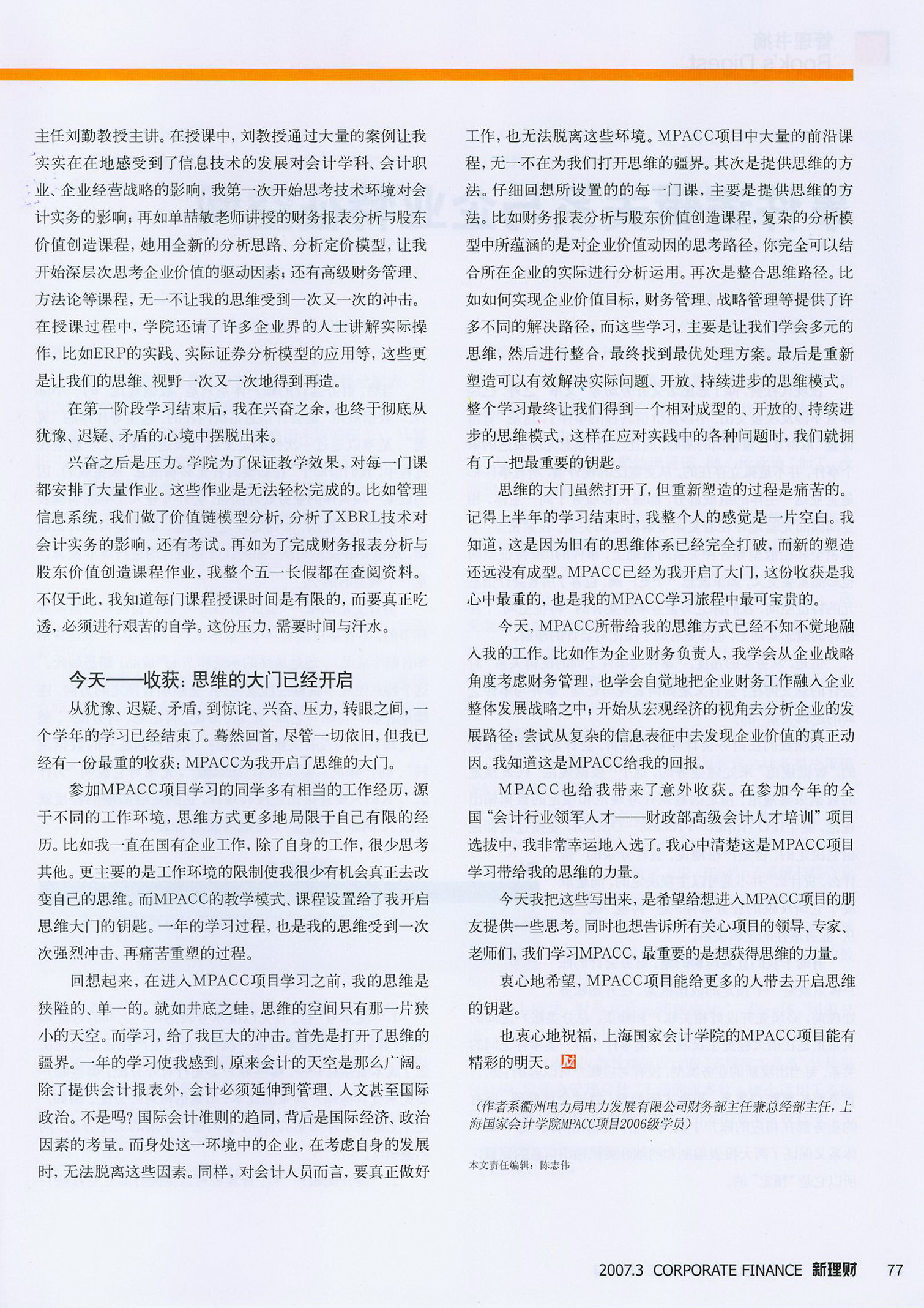 回想起来,在进入MPACC项目学习之前,我的思维是狭隘的、单一的。就如井底之蛙,思维的空间只有那一片狭小的天空。而学习,给了我巨大的冲击。首先是打开了思维的疆界。一年的学习使我感到,原来会计的天空是那么广阔。除了提供会计报表外,会计必须延伸到管理、人文甚至国际政治。不是吗?国际会计准则的趋同,背后是国际经济、政治因素的考量。而身处这一环境中的企业,在考虑自身的发展时,无法脱离这些因素。同样,对会计人员而言,要真正做好工作,也无法脱离这些环境。MPACC项目中大量的前沿课程,无一不在为我们打开思维的疆界。其次,是提供思维的方法。仔细回想所设置的每一门课,主要是提供思维的方法。比如财务报表分析与股东价值创造课程,复杂的分析模型中所蕴涵的是对企业价值动因的思考路径,你完全可以结合所在企业的实际进行分析运用。再次,是整合思维路径。比如如何实现企业价值目标,财务管理、战略管理等提供了许多不同的解决路径,而这些学习,主要是让我们学会多元的思维,然后进行整合,最终找到最优处理方案。最后是重新塑造可以有效解决实际问题、开放、持续进步的思维模式。整个学习最终让我们得到一个相对成型的、开放的、持续进步的思维模式,这样在应对实践中的各种问题时,我们就拥有了一把最重要的钥匙。
