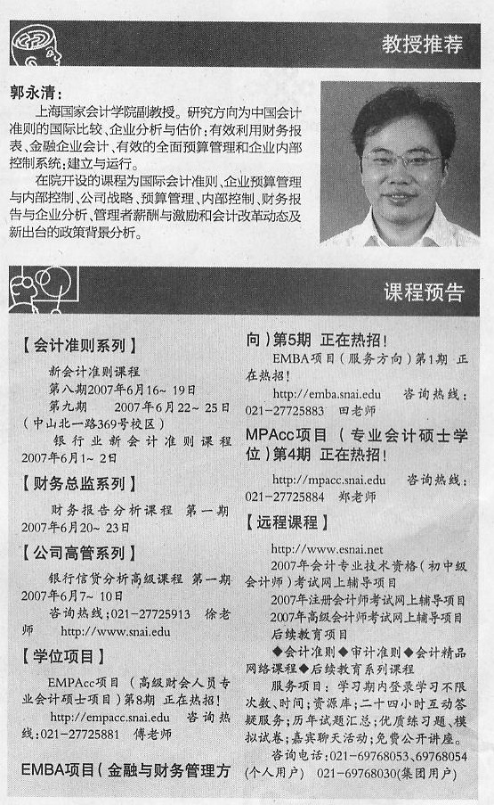 新会计准则课程:第八期 2007年6月16~19日