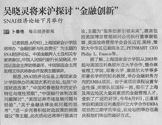《每日经济新闻》2007年5月24日:吴晓灵将来沪探讨“金融创新”-SNAI经济论坛下月举行