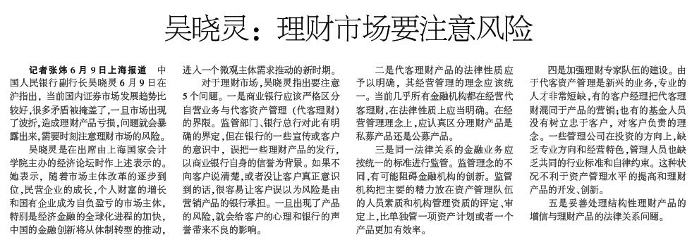 对于理财市场,吴晓灵指出要注意5个问题。一是商业银行应该严格区分自营业务与代客资产管理(代客理财)的界限。监管部门、银行总行对此有明确的界定,但在银行的一些宣传或客户的意识中,误把一些理财产品的发行,以商业银行自身的信誉为背景。如果不向客户说清楚,或者没让客户真正意识到的话,很容易让客户误以为风险是由营销产品的银行承担。一旦出现了产品的风险,就会给客户的心理和银行的声誉带来不良的影响。
