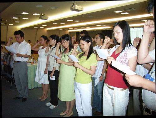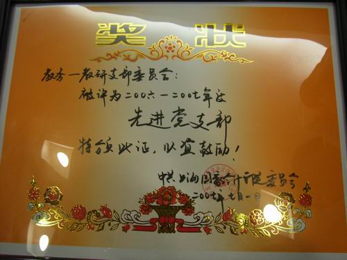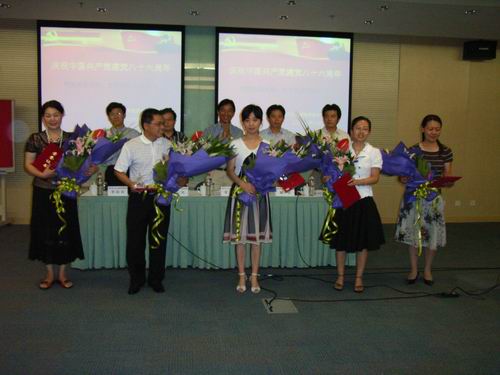 党委副书记、副院长李扣庆同志主持了第二环节的各项议程。首先举行了新党员入党宣誓仪式,由党委副书记刘勤同志领誓。随后,党委委员、副院长管一民宣读了表彰先进党支部和优秀党员的决定。教研教务党支部被评选为2006年度至2007年度先进党支部,易宏勋等5位同志被评选为2006年度至2007年度优秀党员。党委书记、院长夏大慰同志和其他四位党委委员向获得先进党支部的代表和优秀党员表示了祝贺并颁发了奖状。荣获优秀党员的马丽娜同志发表了声情并茂的得奖感言。其后,党委委员、副院长谢荣通报党委关于各支部换届改选的名单。