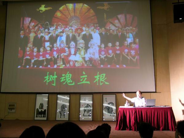 黎中城先生从分析京剧的魅力来源于何种艺术特质入手开始了他精彩的讲演。他认为京剧是诗歌、音乐、舞蹈三位一体的艺术体现,依据中国的传统美学原理而产生,所谓“情动于中而形于言;言之不足故嗟叹之;嗟叹之不足故咏歌之;咏歌之不足,不知手之舞之足之蹈之也”。