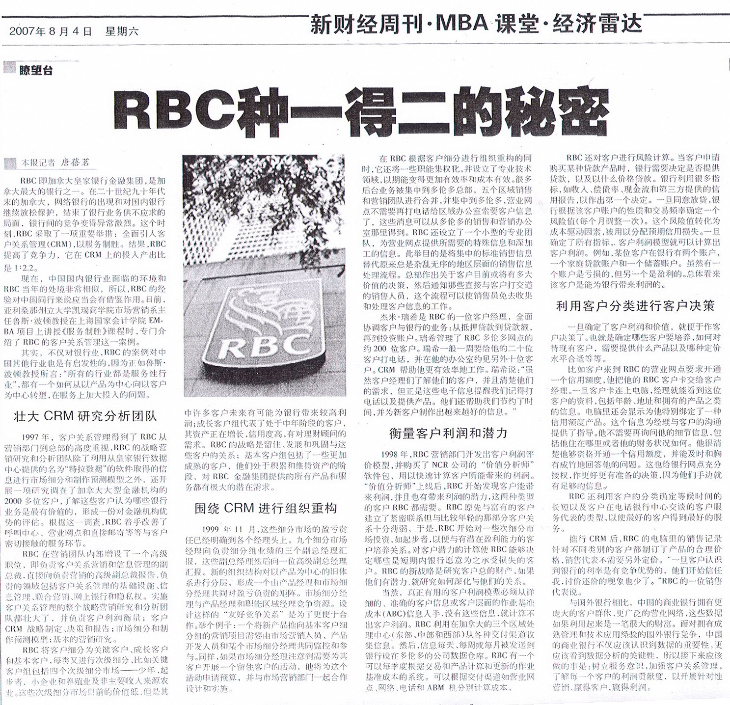 RBC即加拿大皇家银行金融集团,是加拿大最大的银行之一。在二十世纪九十年代末的加拿大,网络银行的出现和对国内银行继续放松保护,结束了银行业务供不应求的局面,银行间的竞争变得异常激烈。这个时刻,RBC采取了一项重要举措:全面引入客户关系管理(CRM),以服务制胜。结果,RBC提高了竞争力,它在CRM上的投入产出比是1:2.2。